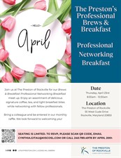 Join us at The Preston of Rockville for our Brews & Breakfast Professional Networking Breakfast meet up. Enjoy an assortment of delicious signature coffee, tea, and light breakfast bites while networking with fellow professionals.