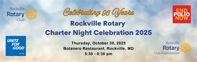 The Rotary Club of Rockville Charter Night 2025 Kindly join us for our annual Charter Night 2025 on Thursday, October 30, 2025. 5:30 p.m. Cocktail Reception and Appetizers 6:00 P.M. Event Begins. The Charter Night is an annual Celebration of the Rotary Club of Rockville, and it recognizes our Grants Recipients. Celebrating our 96th Year! 1929-2025 Kindly Register Here: https://buytickets.at/rockvillerotary/1857088 We'll look back at our accomplishments this past year, including our Flags for Heroes Event, our vision for the future, and highlight the 2025 Rotary Club of Rockville Foundation grants recipients. Most local 2025 grant awardees who are not members of the Rotary Club of Rockville will receive an email with instructions on how to register one person to receive the grant at the event. Reception: 5:30 p.m.-6:00 p.m. Appetizers will be served in a private room on the lower level of Botanero Restaurant. Please use the side entrance to enter the room. A cash bar will be available. Dinner: 6:00 p.m. We have curated a variety of main dishes and side dishes to appeal to everyone's taste.